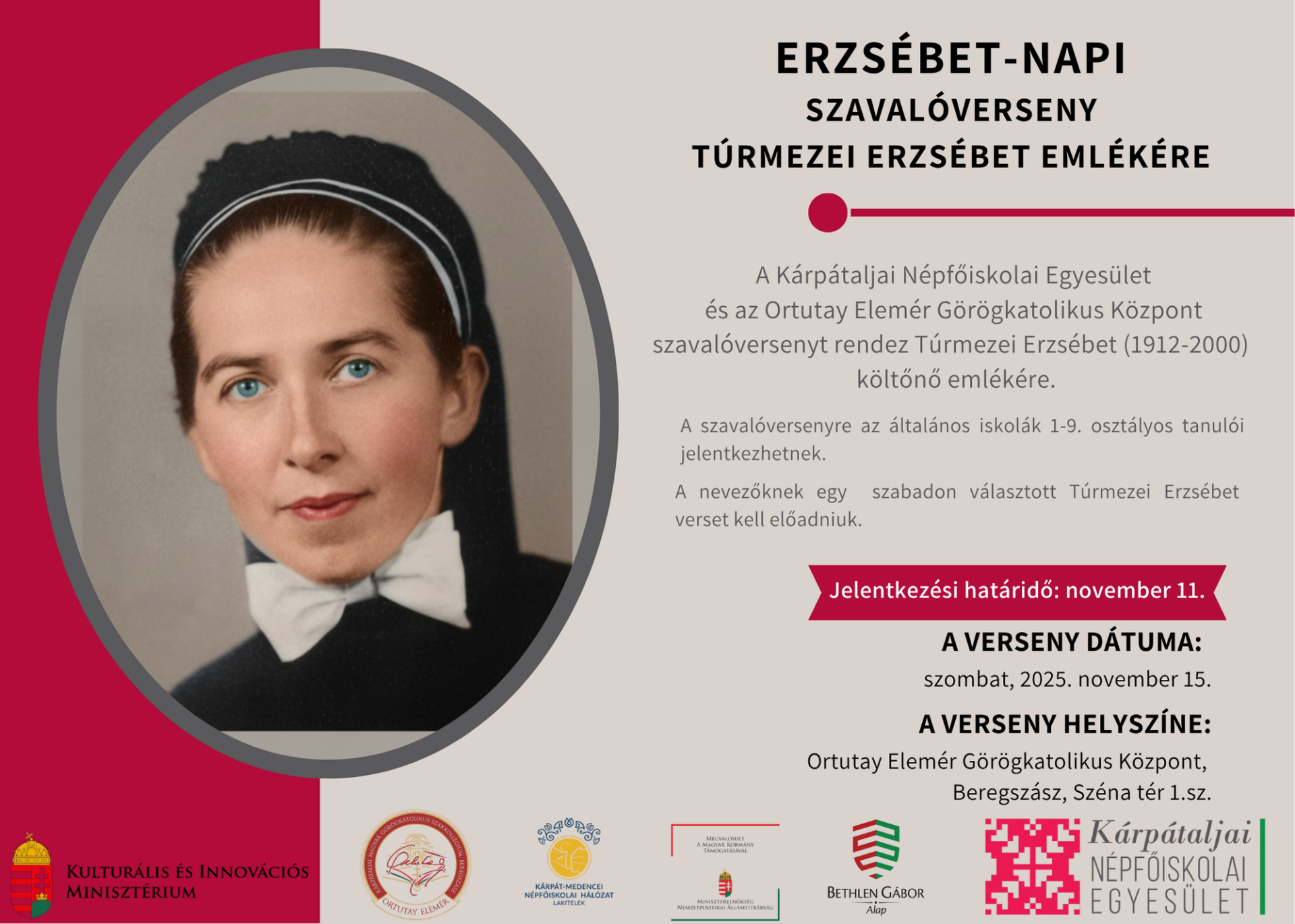 A Kárpátaljai Népfőiskolai Egyesület és az Ortutay Elemér Görögkatolikus Központ szavalóversenyt hirdet Túrmezei Erzsébet (1912–2000) költő és műfordító emlékére.