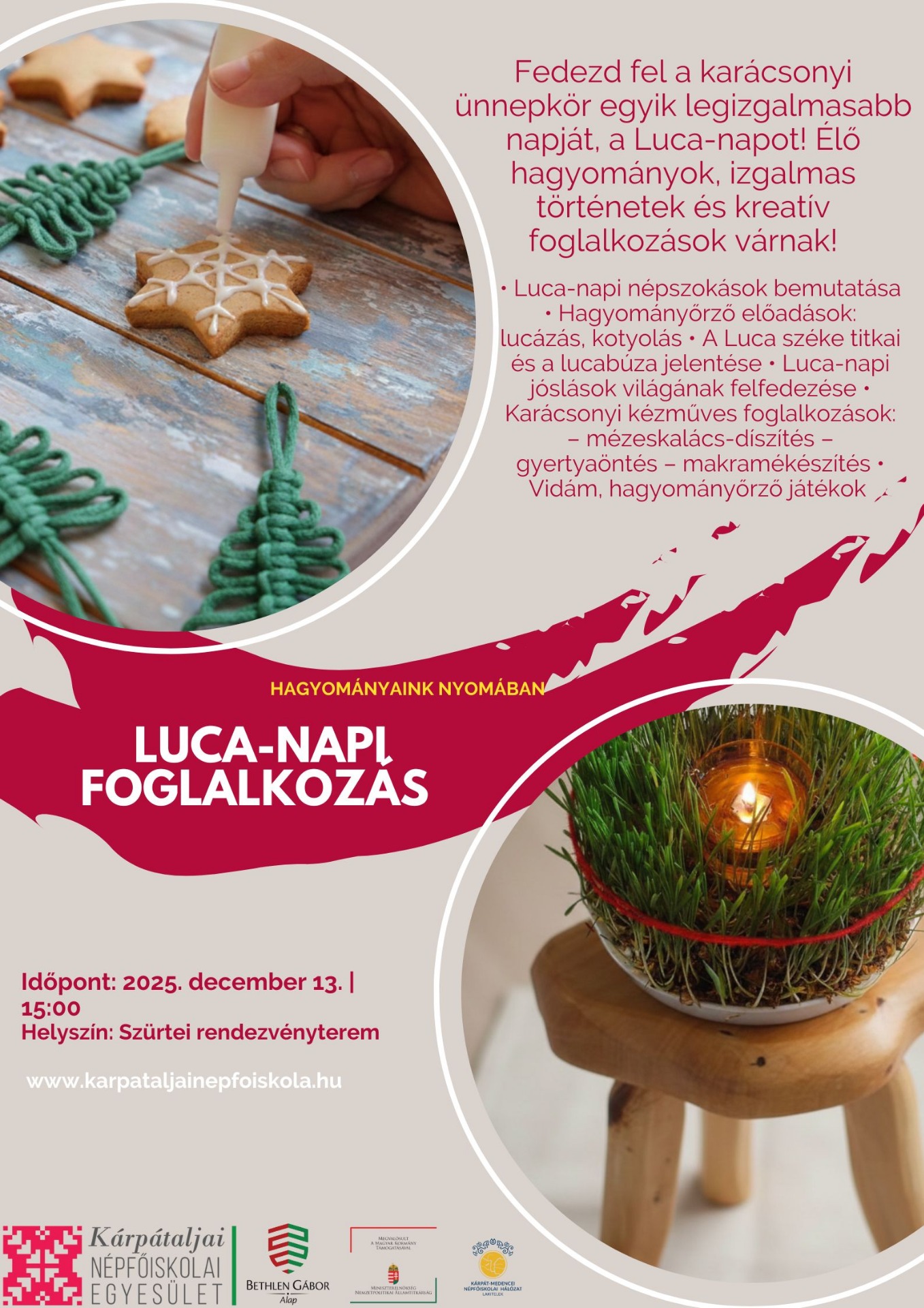 A Néphagyományaink nyomában c. programsorozatunk következő alkalma a karácsonyi ünnepkörhöz kapcsolódik. Az érdeklődők megismerkedhetnek az adventi időszak egyik jeles napjához, a Luca-naphoz fűződő népszokásokkal.